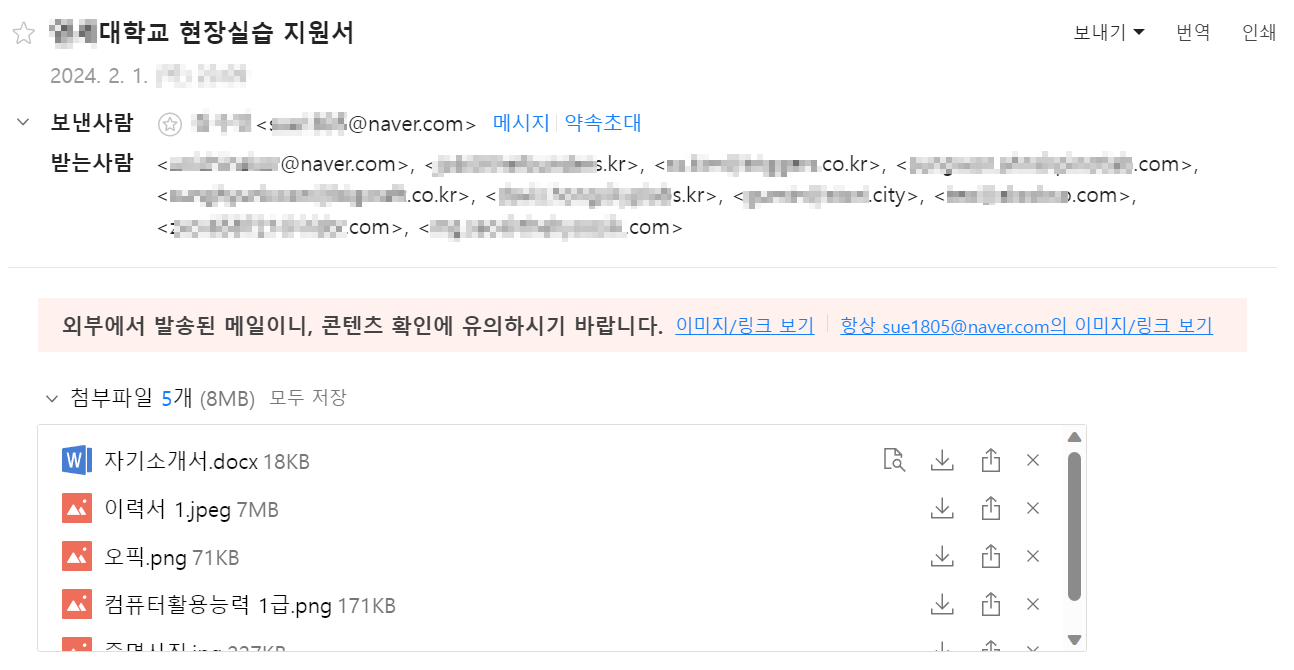 모 대학교 학생이 나한테 보내온 인턴지원서. 그런데 수신인 목록이 이상하다???