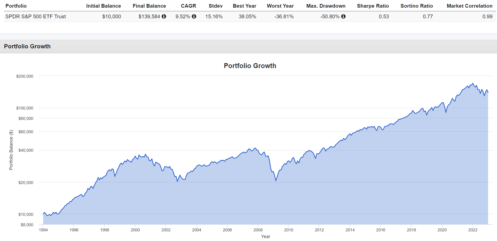 1994년 부터 2022년 까지 약 30여년간 미국의 대표 S&P500 인덱스 ETF 인 SPY 의 연평균 복리수익률은 9.52% 였으며, 이 기간에 누적 수익률은 원금대비 14배가 증가했습니다.