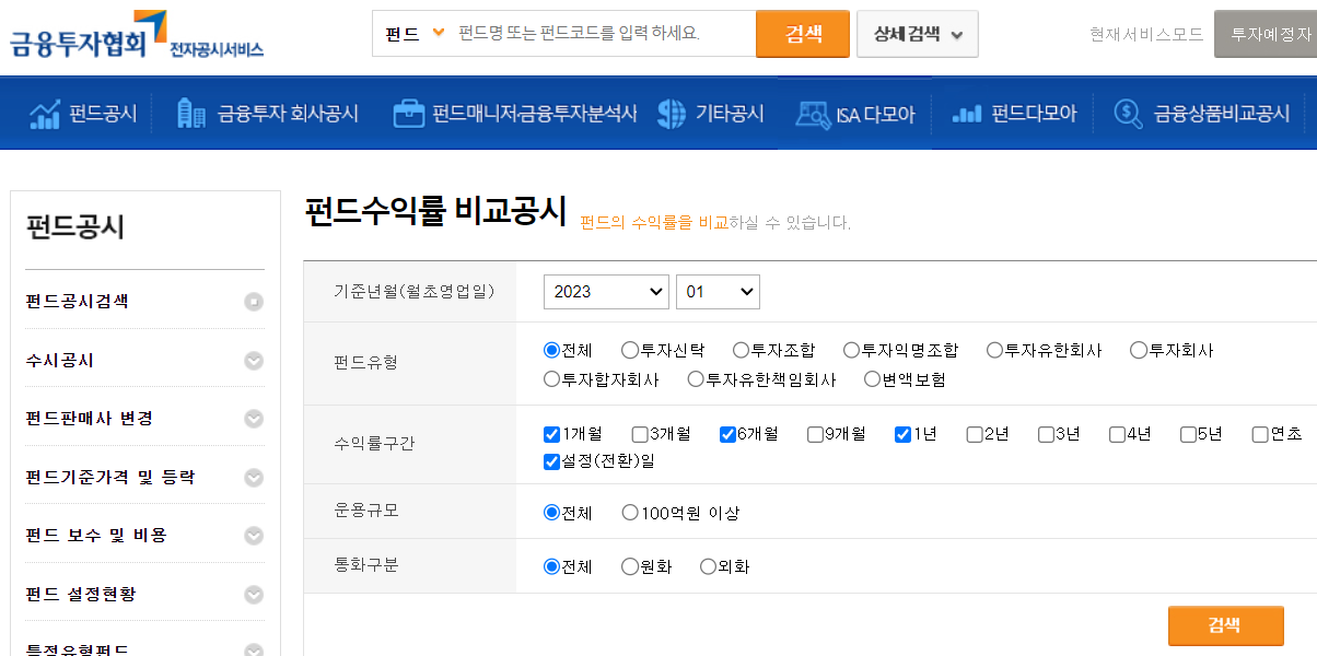 금융투자협회 홈페이지에서 펀드수익률 현황을 살펴볼 수 있습니다.