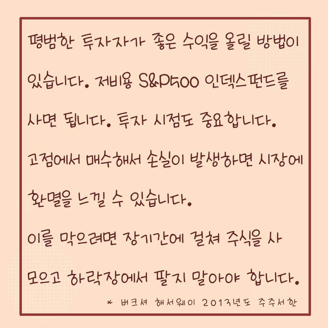 워런 버핏은 일반투자자들에게 여러차례에 걸쳐 미국 S&P500 인덱스 펀드 (ETF) 를 꾸준히 매수할 것을 추천했습니다. 이렇게만 하면 대부분의 기관투자자들이나 투자전문가들 보다 더 나은 성과를 거둘 수 있다는 것인데요.